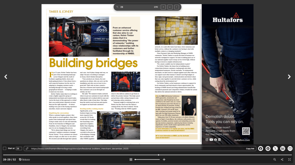 The feature, titled “Building Bridges,” highlights how Kelvin Timber continues to adapt and evolve to better support tradespeople, builders and homeowners across Glasgow and the surrounding areas.