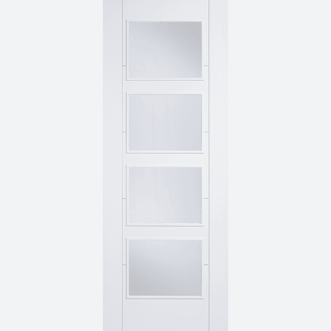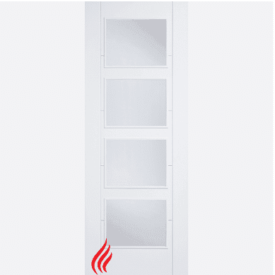 Four large clear glazed panels are positioned between decorative vertical grooves, with raised moulding and primed semi solid core in white. NB: FD30’s supplied Solid Core